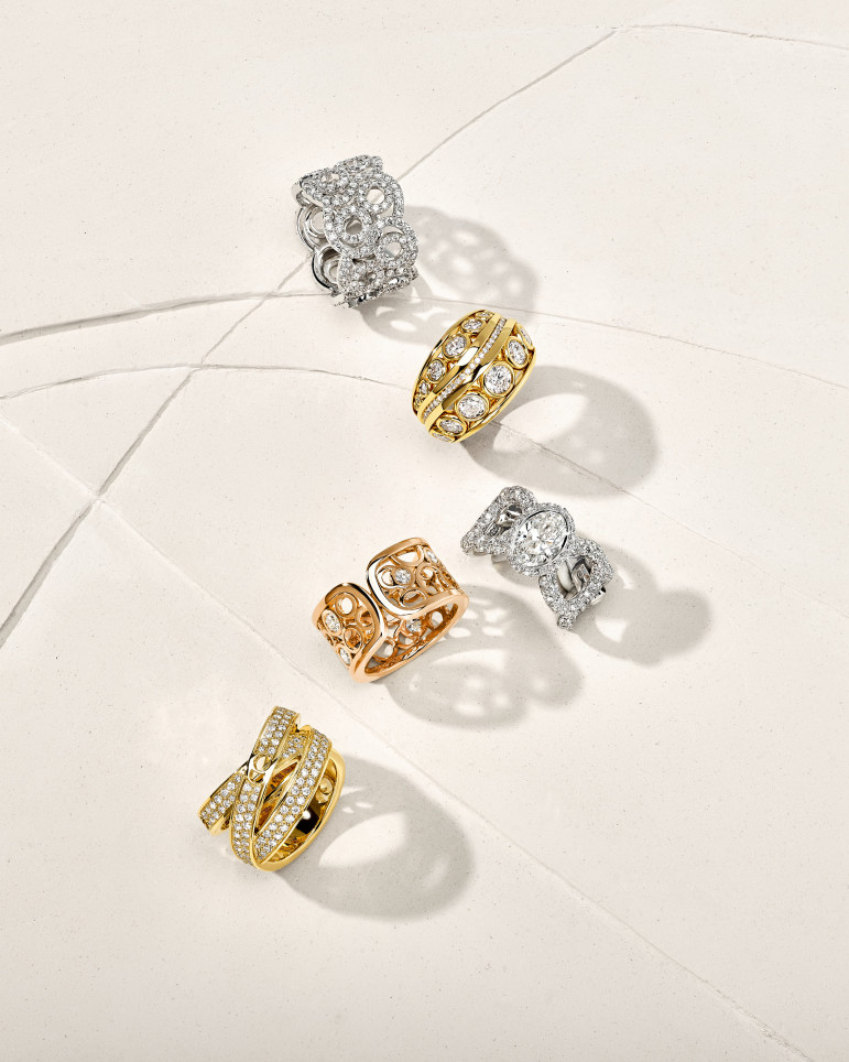 Generous in gold and diamonds, these rings and earrings have a particularly intense brilliance. Their relatively imposing structure dresses the finger and the neck with volume and character. The Couture creations sparkle with creativity in a style that is both modern and casual.