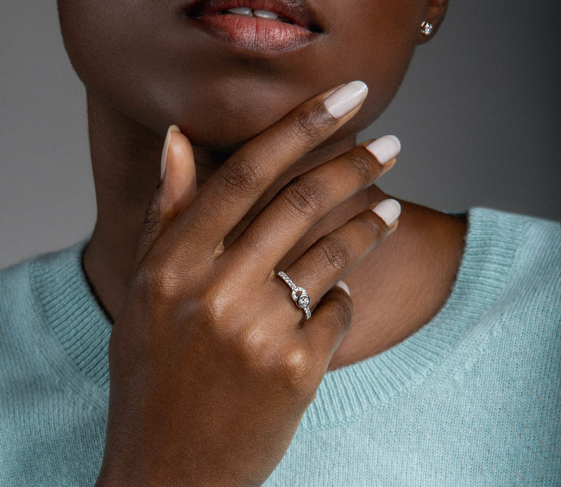 Through its refined and sparkling design, the CO half-pavé set ring offers a modern and contemporary style. In this design, COURBET' signature, expressed by the C pavé and the O set with a diamond, is enhanced by the half-pavé white, rose or yellow ring.
