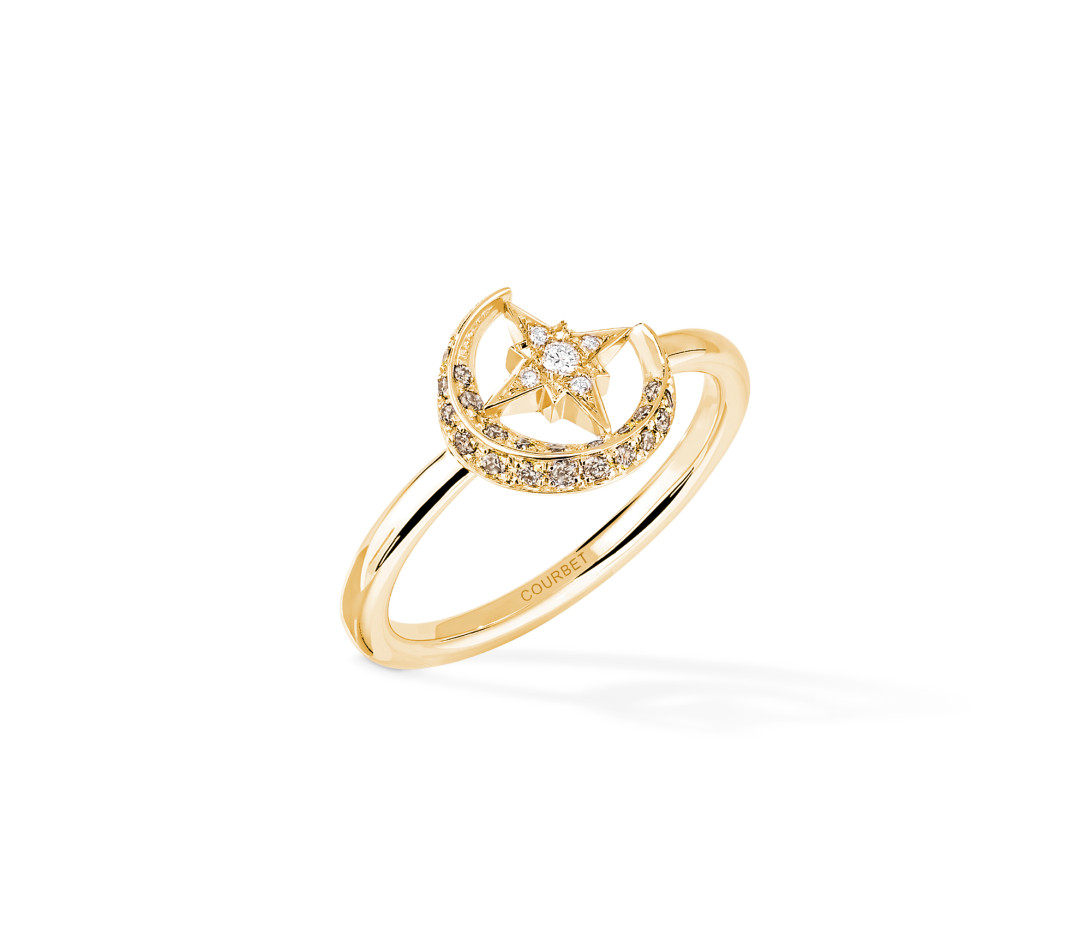 Astral and poetic, the Galatée ring is a compendium of the universe common to COURBET and EnjoyPhoenix. Between sky and sea, this creation pays tribute to nature, a subtle reference to the Nereids and to ancient mythology. The C of COURBET becomes a crescent moon set with cognac-coloured lab-grown diamonds, surrounding a four-pointed star to better reveal the brilliance of the recycled gold. A fragment of the galaxy within reach, available in white, yellow and rose gold, for an airy and ever committed look.