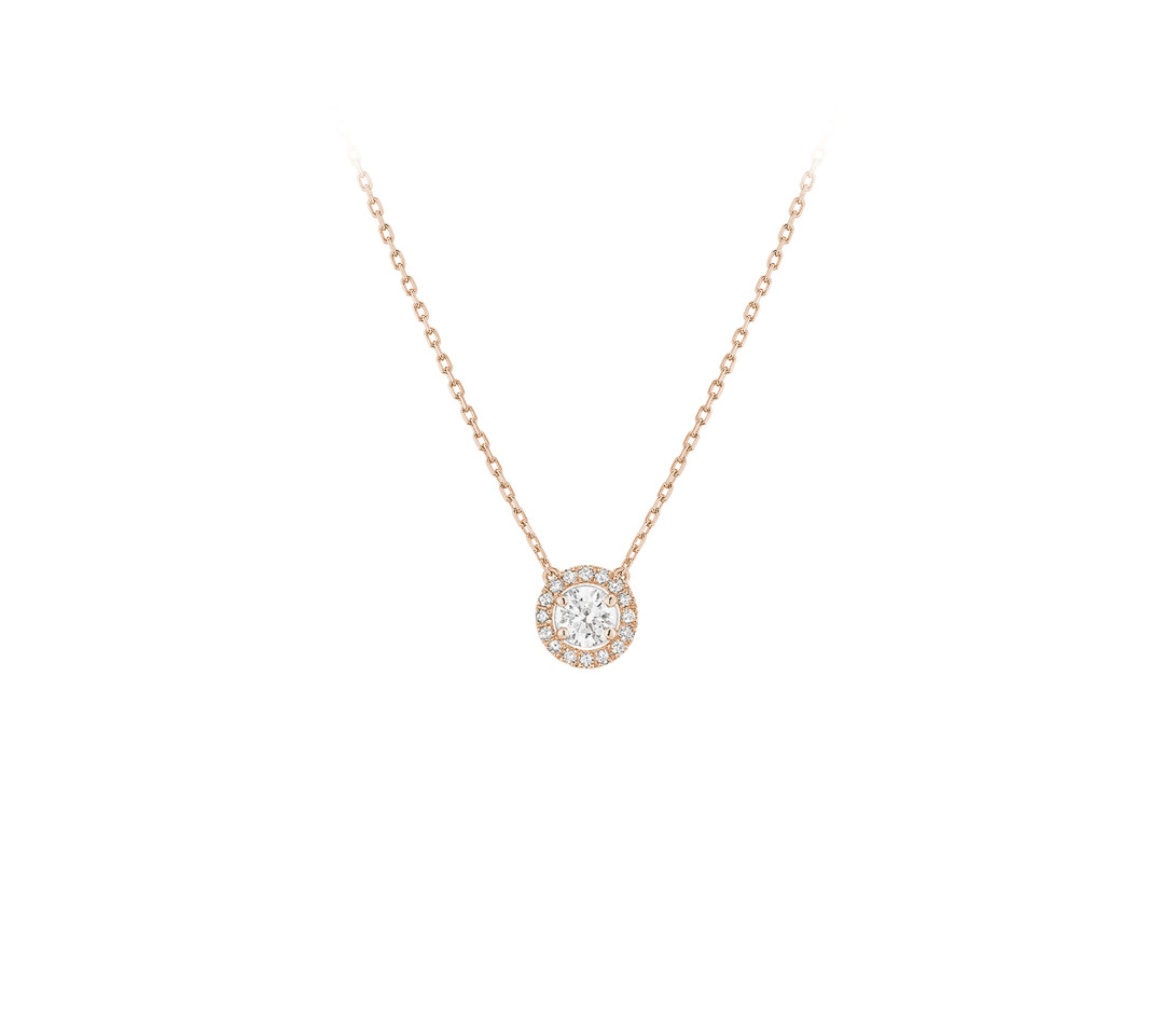As a true sunburst nestled in the hollow of the neck, the Halo pendant necklace warms with its radiance and the constellation of micro-set diamonds surrounding the central brilliant-cut diamond.